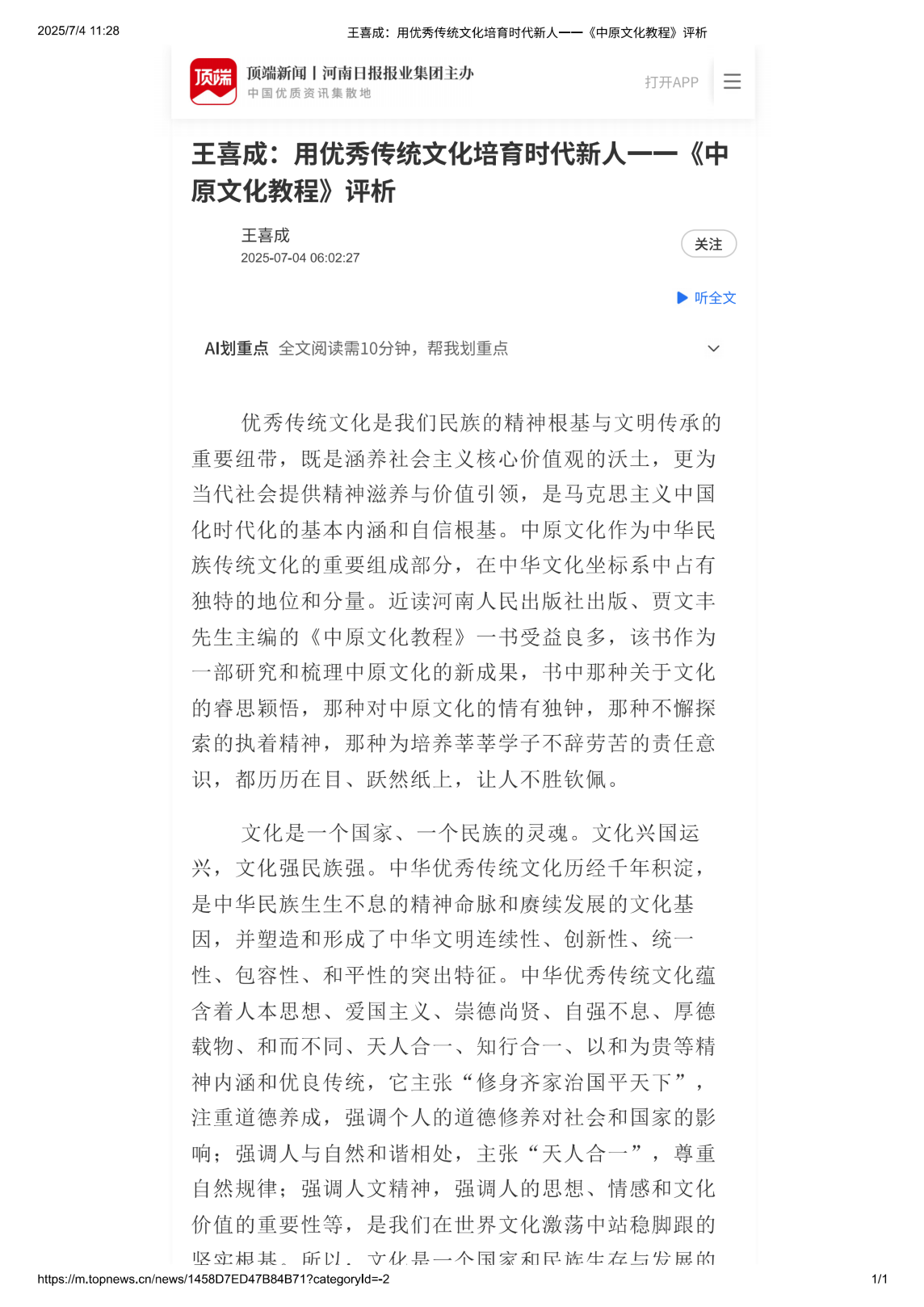 yl6809永利长王喜成在“顶端新闻”发表《用优秀传统文化培育时代新人一一中原文化教程评析》