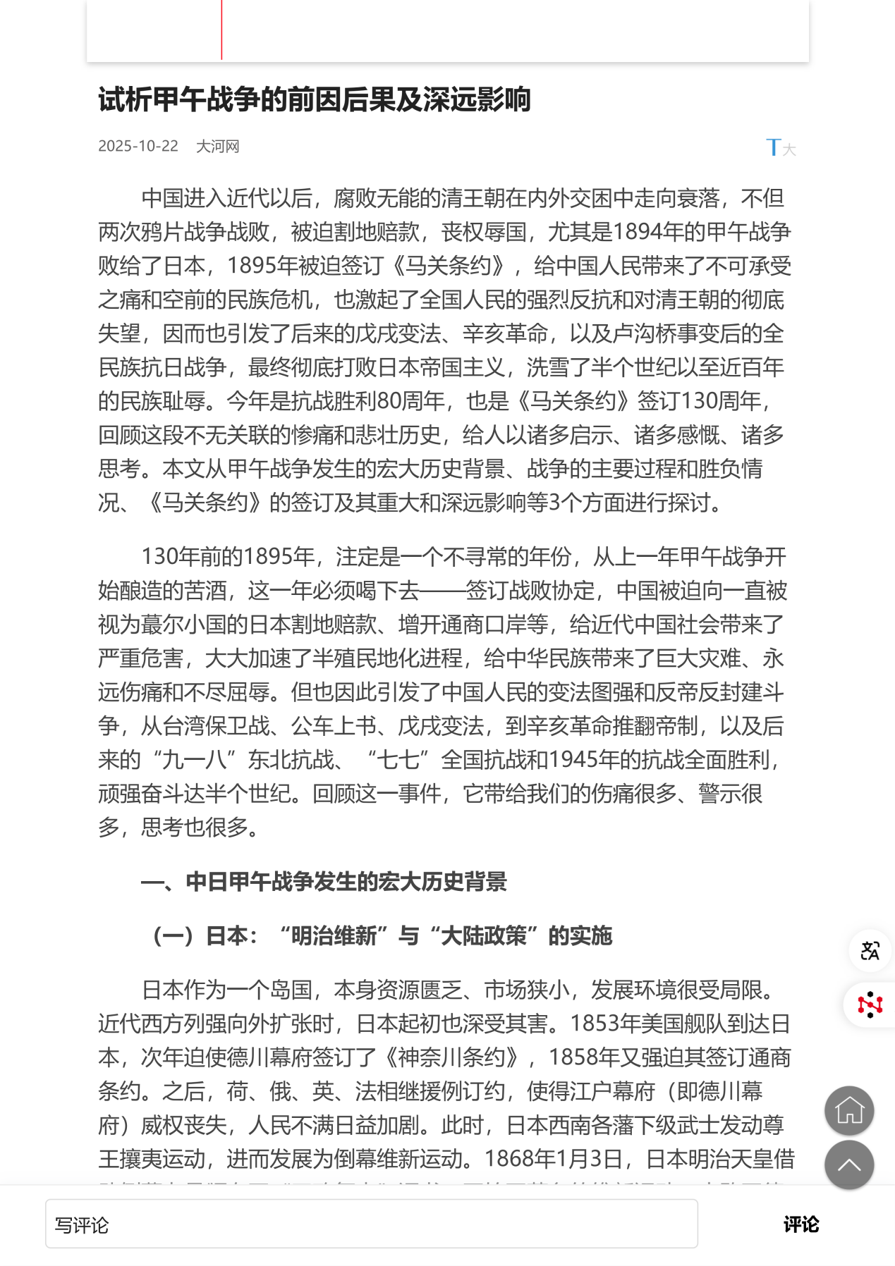 yl6809永利长王喜成在“大河网”发表《试析甲午战争的前因后果及深远影响》